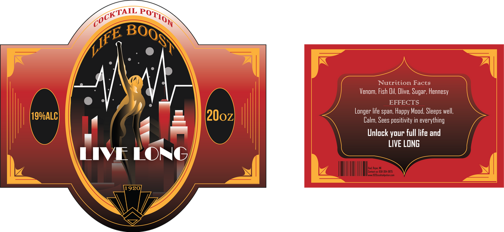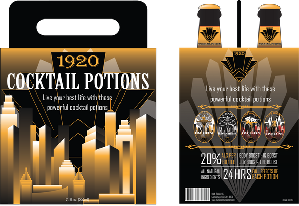 I came up with a cocktail potion brand with a 1920's theme to have that authentic vintage vibe. I used four color themes: Gold, Black, Red, and White. Also, four distinctive drinks that have certain uses: